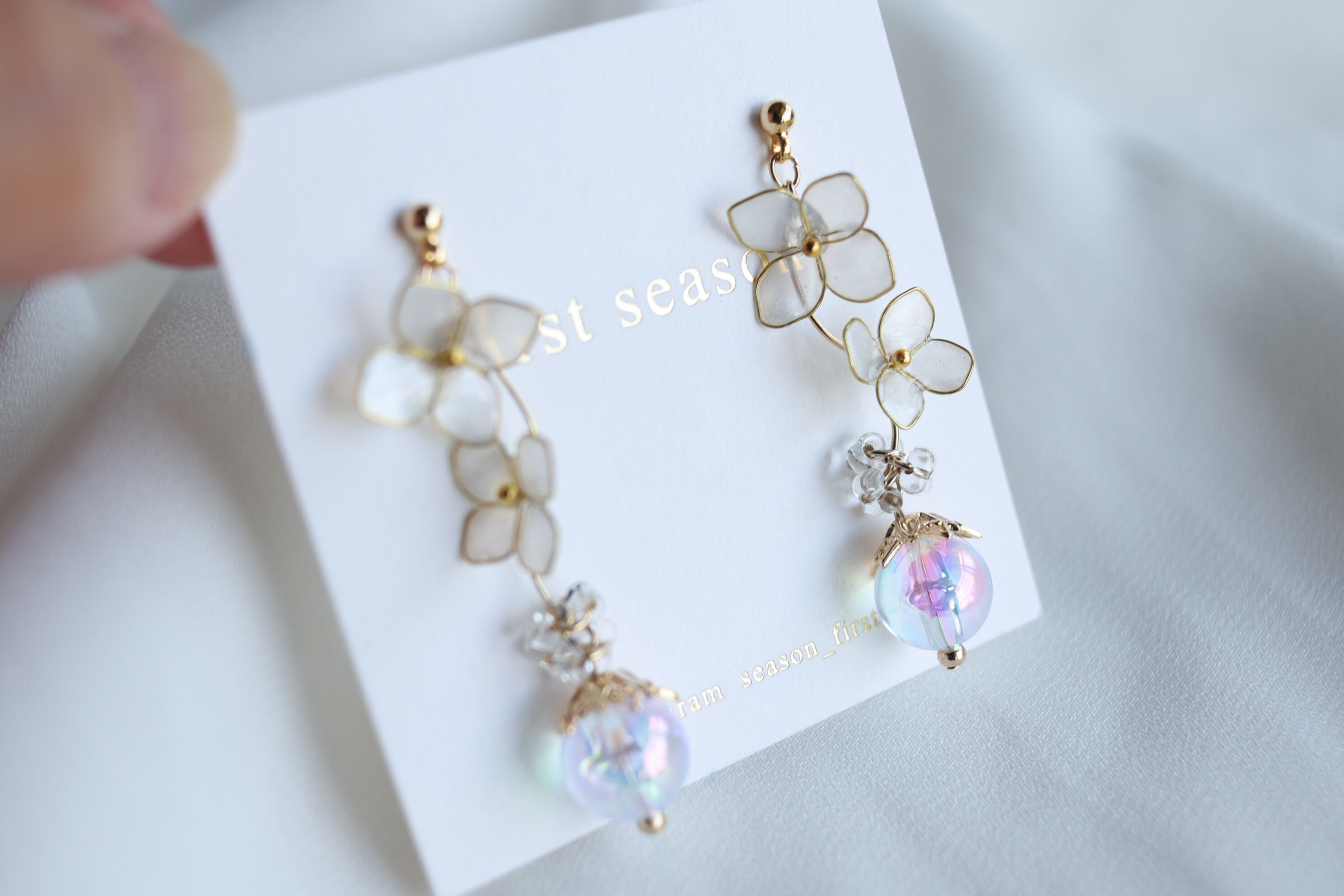 雨上がりの紫陽花からキラキラと雨粒が滴り落ちるようなイメージのピアス・イヤリングを作りました。