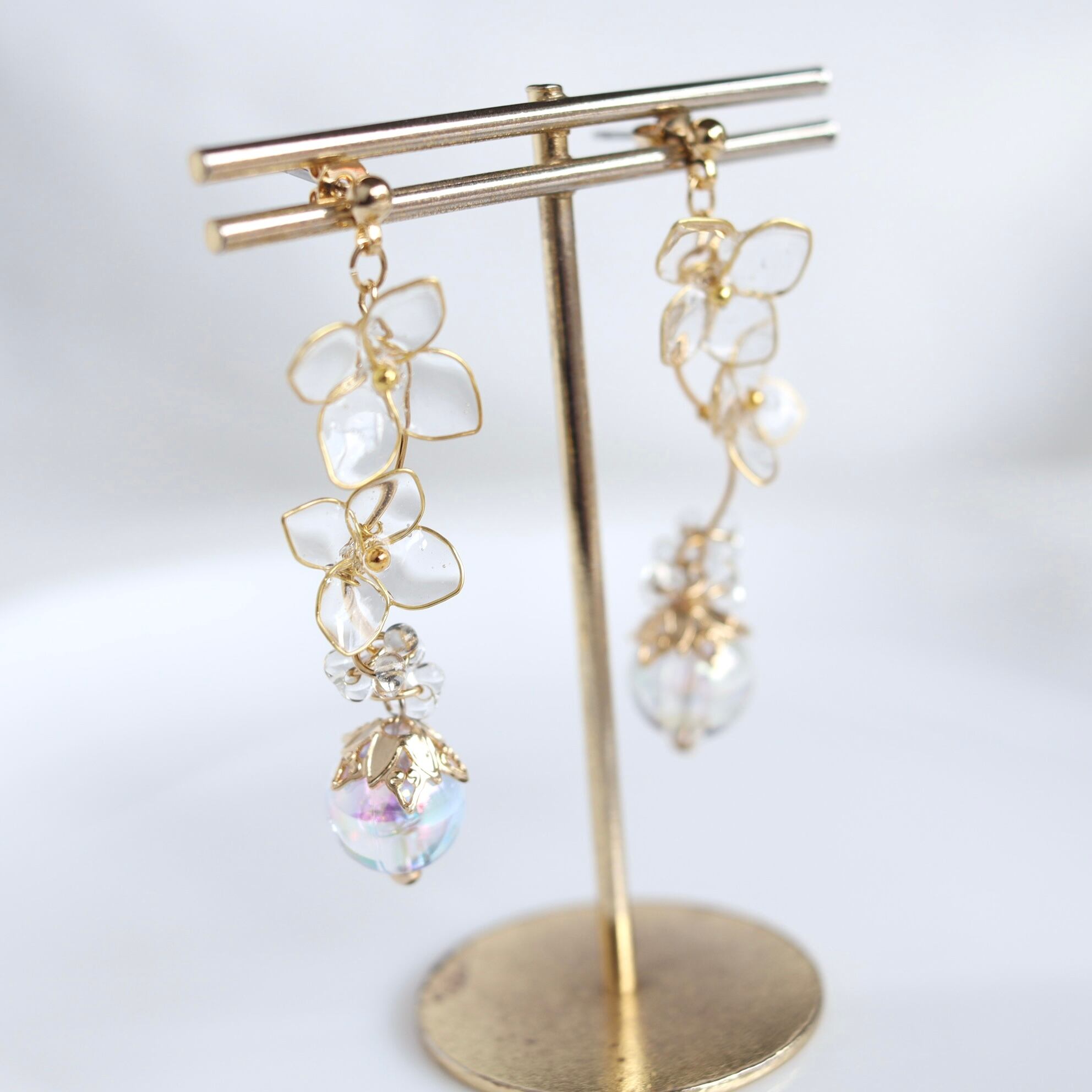 クリアな紫陽花やビーズがキラキラ輝いて暑い夏コーデにもぴったりな透明感溢れるピアス・イヤリングに仕上がりました。