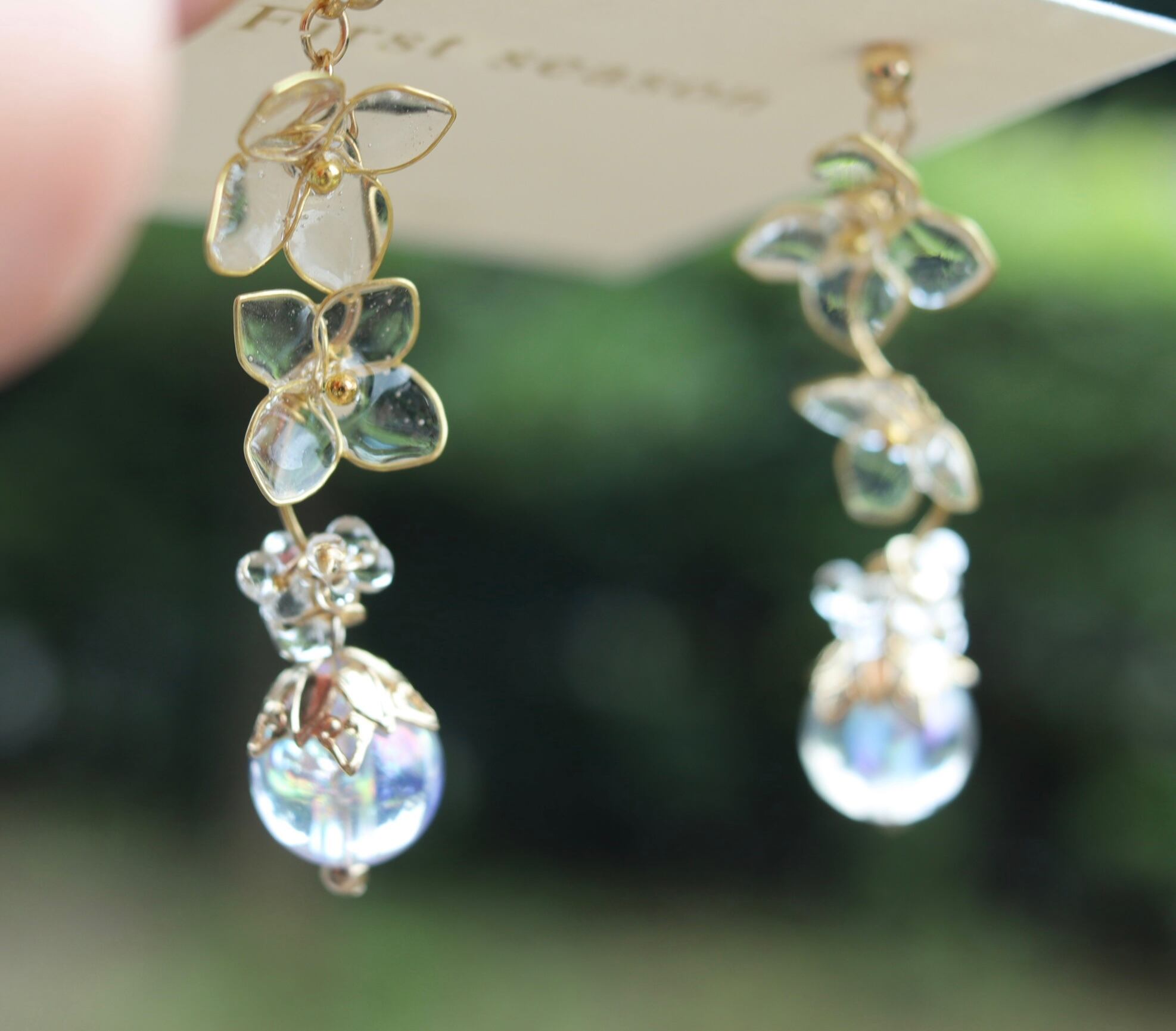 氷のような紫陽花からキラキラと雨粒が滴り落ちるようなイメージのピアス・イヤリングを作りました。