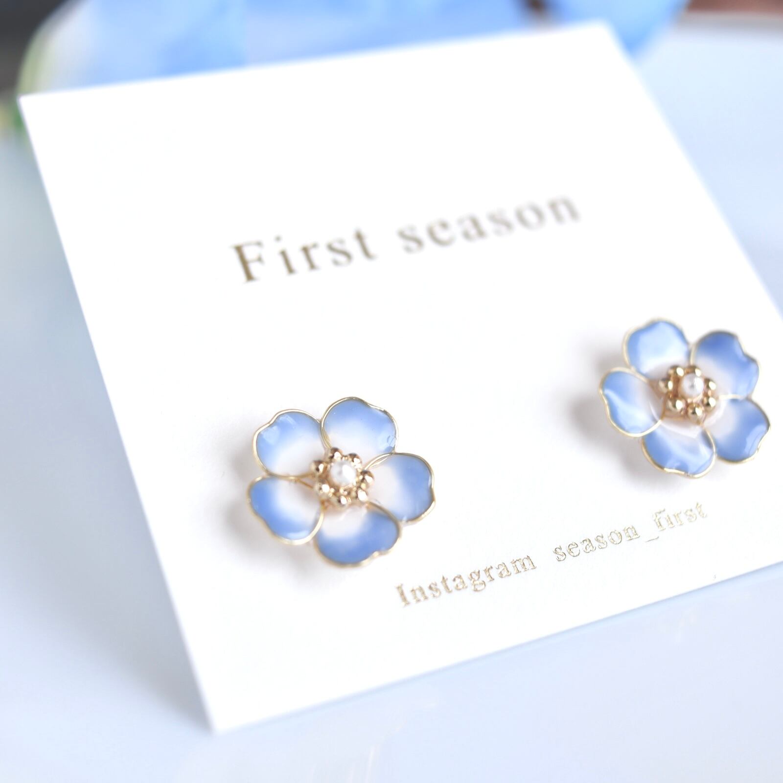 ゴールド 樹脂ピアス ブルー フープピアス フラワー #花 フープ お出かけ あじさい 花びら レジン 贈り物 誕生日 イベント #プレゼント #ギフト #さくら #桜 #Nemophila #春アクセサリー #ネモフィラアクセサリー #ワイヤーアクセサリー 花 #SSコレクション 春コーディネート #記念日 #First season #ファーストシーズン 小ぶり #春アクセサリー #青い花 #ディップアクセサリー